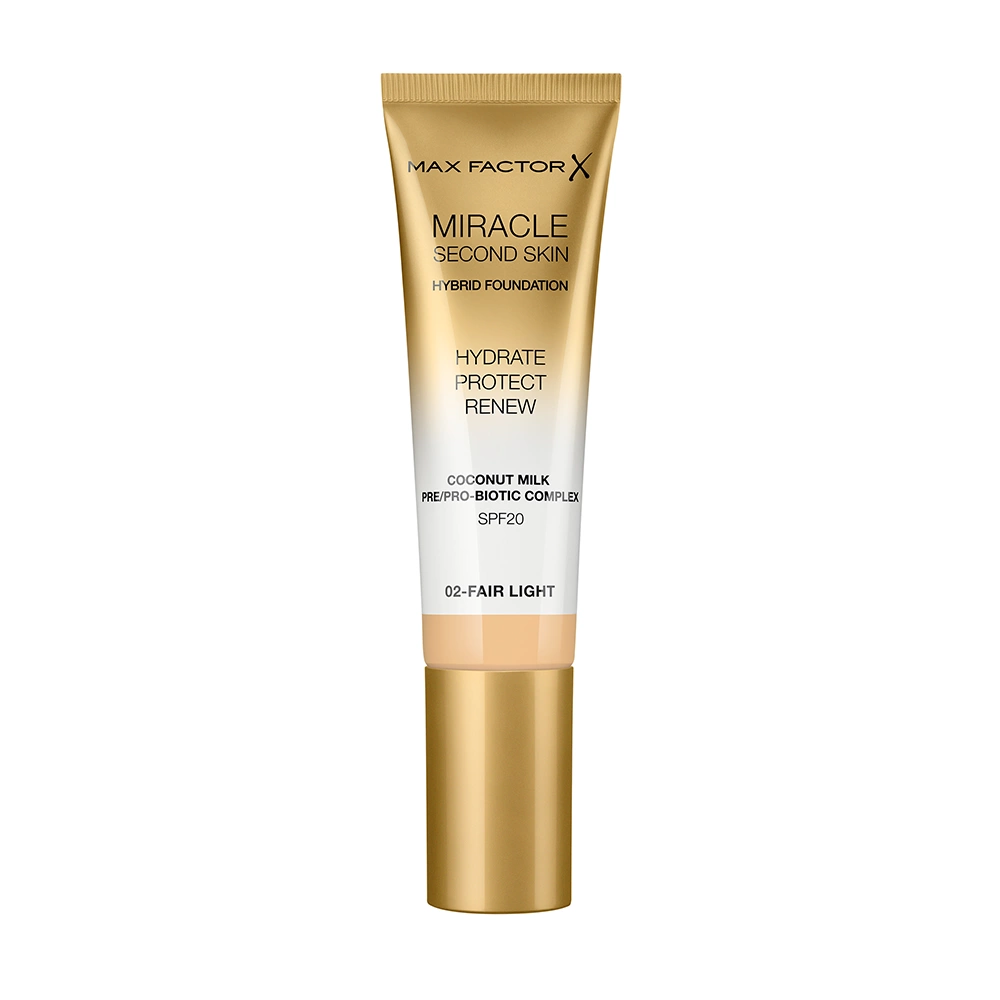 Max Factor Miracle Second Skin è una fondotinta ibrido unico. Grazie al latte di cocco di origine naturale garantisce idratazione alla pelle per tutto il giorno. La sua formula leggera, ricca e facilmente sfumabile offre una copertura impercettibile. Regala un finish naturale che si fonde con la pelle. È arricchito con pre e probiotici per aiutare le difese naturali della pelle. La formula Miracle Second Skin è clinicamente testata per aiutare il rinnovamento cellulare e contiene SPF20 per una protezione UVA e UVB. Questo fondotinta è adatto a tutti i tipi di pelle, compresa quella sensibile.